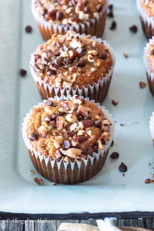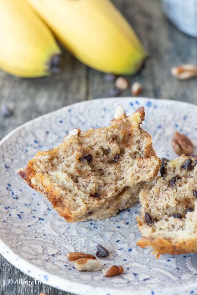 I like topping our gluten-free banana muffins with chopped pecans and dairy-free mini chocolate chips, but this topping is optional. As the muffins bake, the chopped pecans toast and become golden, so you are treated to a crunchy, melty-chocolate topping.