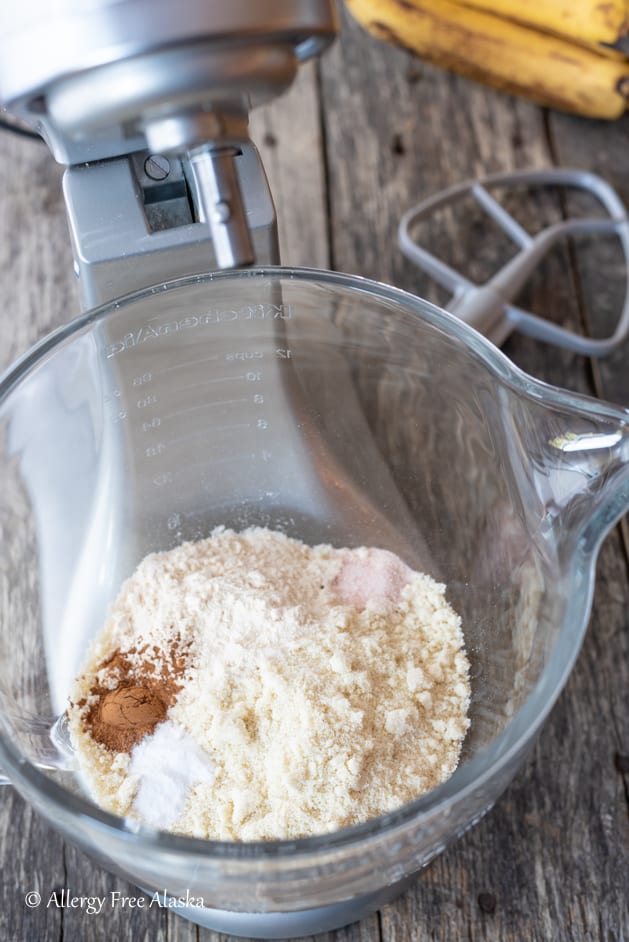 - Combine the blanched almond flour, coconut flour, cinnamon, baking soda, and sea salt in a large mixing bowl.