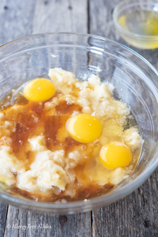 - Whisk the mashed bananas, eggs, honey, coconut oil, and vanilla extract in a separate mixing bowl.