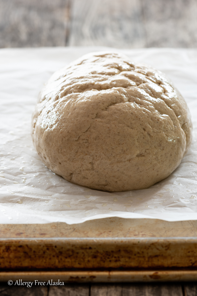 So how do you create workable gluten-free bread dough? In this recipe, I use powdered psyllium husk. Psyllium husk powder helps to retain moisture during baking and it provides more elasticity to the dough so that it can maintain its shape. The dough is a little stickier than gluten-containing bread dough, but it can still be easily formed into a gluten-free boule that will hold its structure in the oven. As it bakes, the dough gently rises and doesn’t spread.