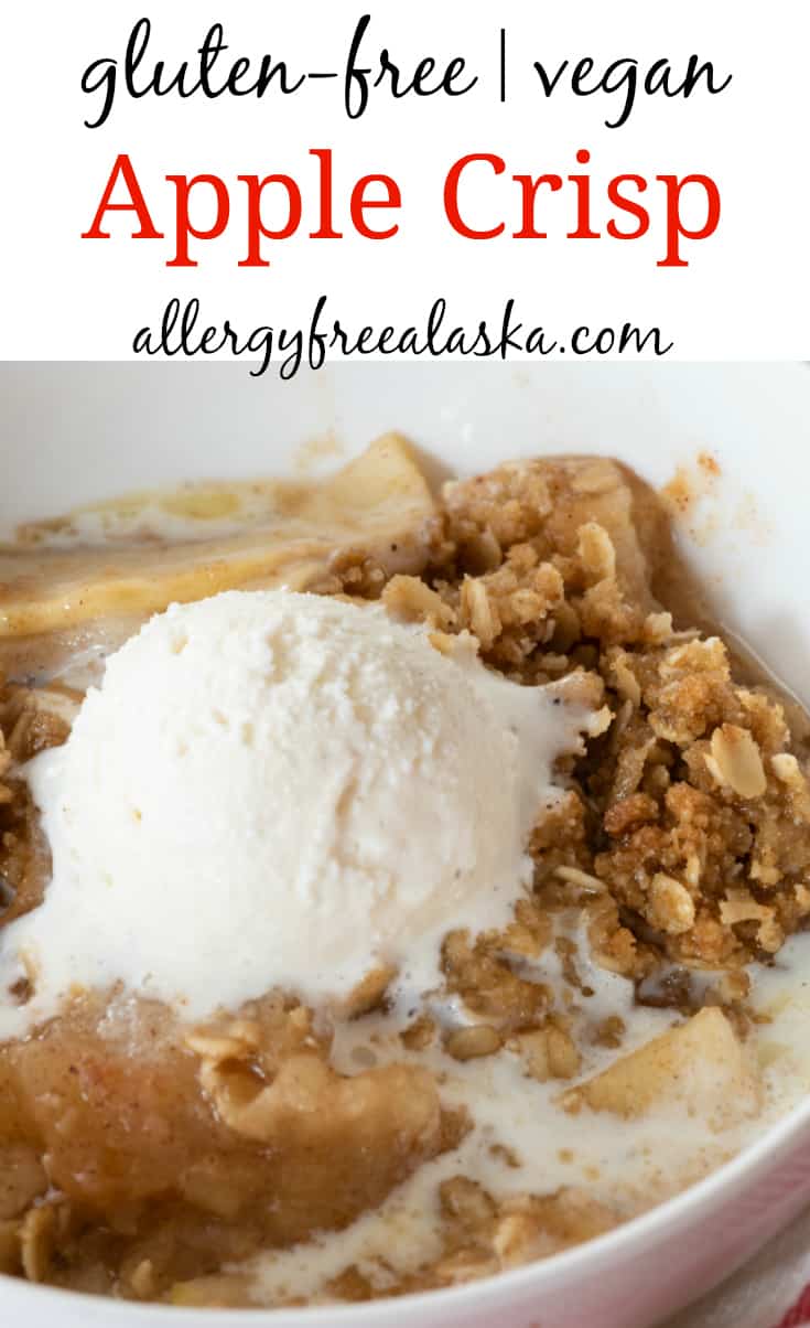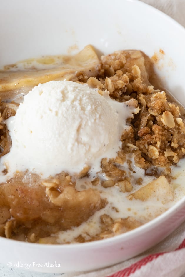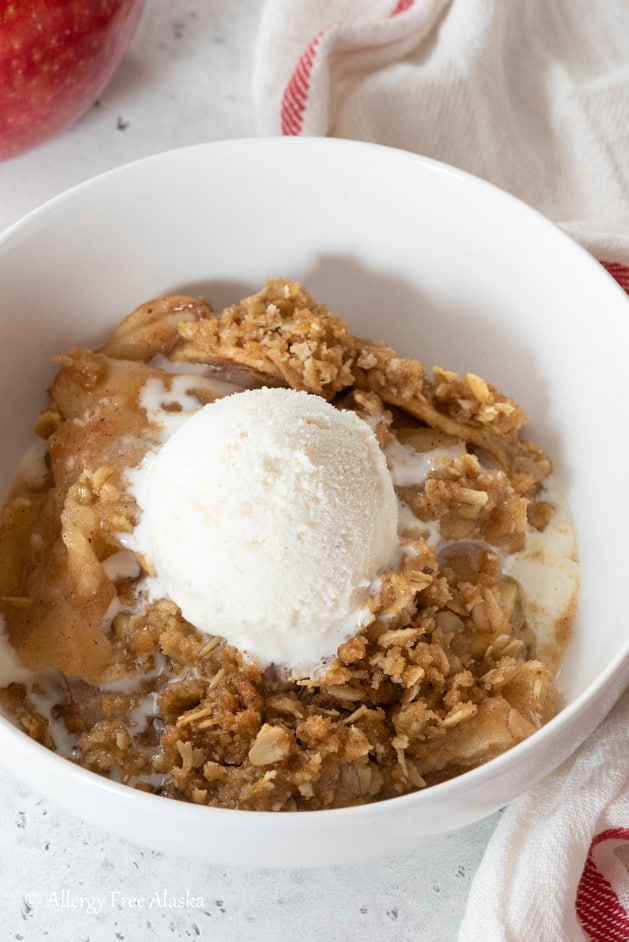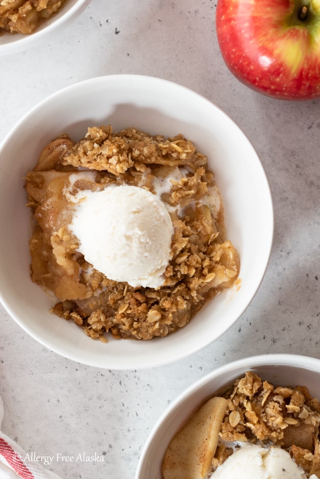 Perfectly tender Honeycrisp apples are smothered with a sweet and crunchy dairy-free oatmeal topping in this gluten-free apple crisp. It's such a wonderful fall treat, spiced with fragrant cinnamon and nutmeg. Top it off with a scoop of your favorite dairy-free vanilla ice cream and vegan caramel sauce.