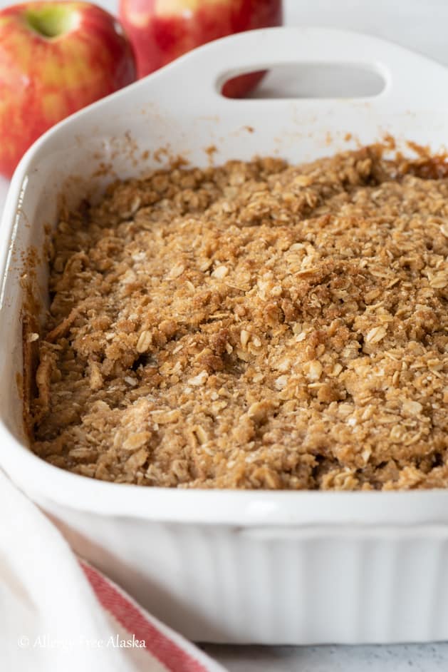 Perfectly tender Honeycrisp apples are smothered with a sweet and crunchy dairy-free oatmeal topping in this gluten-free apple crisp.