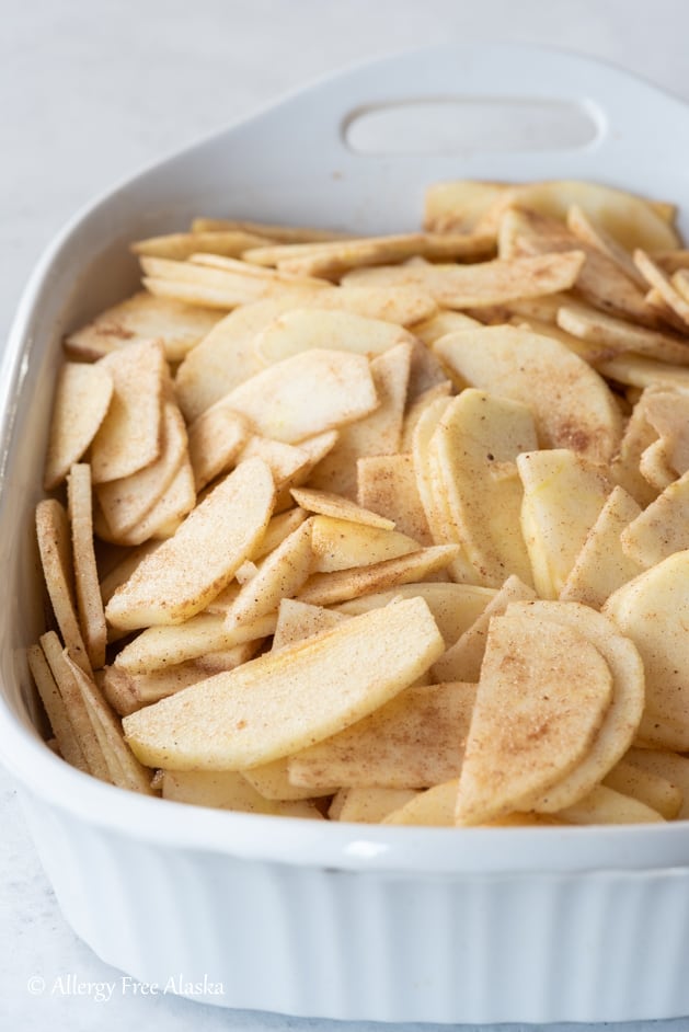 - Pour the apples into the prepared baking dish, and distribute them out evenly across the bottom of the pan (I find giving the baking dish a good shake also helps the apples settle a bit).