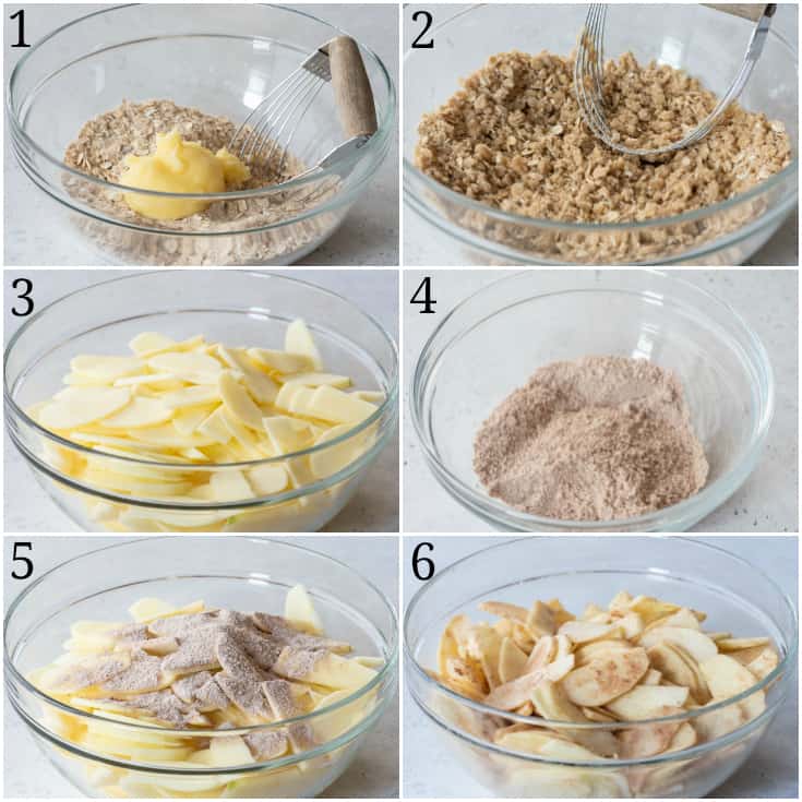 - Sprinkle on the topping, and spread it out evenly across the top of the apples.