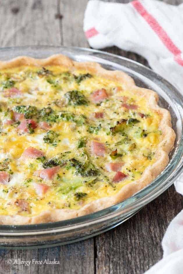 This Gluten-Free Quiche is such a treat for my family. It starts with an incredibly flaky gluten-free pie crust, and is filled with silky eggs and a savory ham and broccoli filling. Also dairy-free!