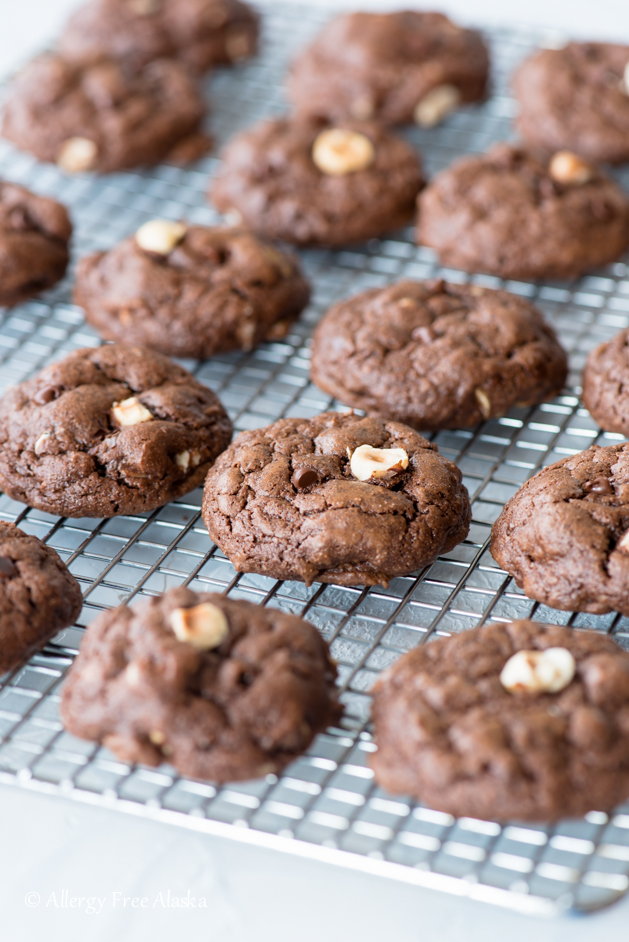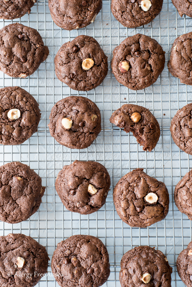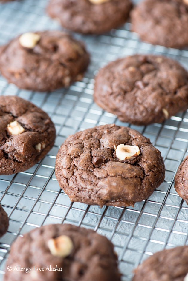 I knew I wanted these cookies to be soft and decadent, so I used the chocolate cookie dough from my Gluten Free Crinkle Cookies recipe as a base for this recipe (If you haven't tried my recipe yet for Crinkles, you're missing out!). I added to it instant coffee powder, dairy-free chocolate chips, and toasted hazelnuts.