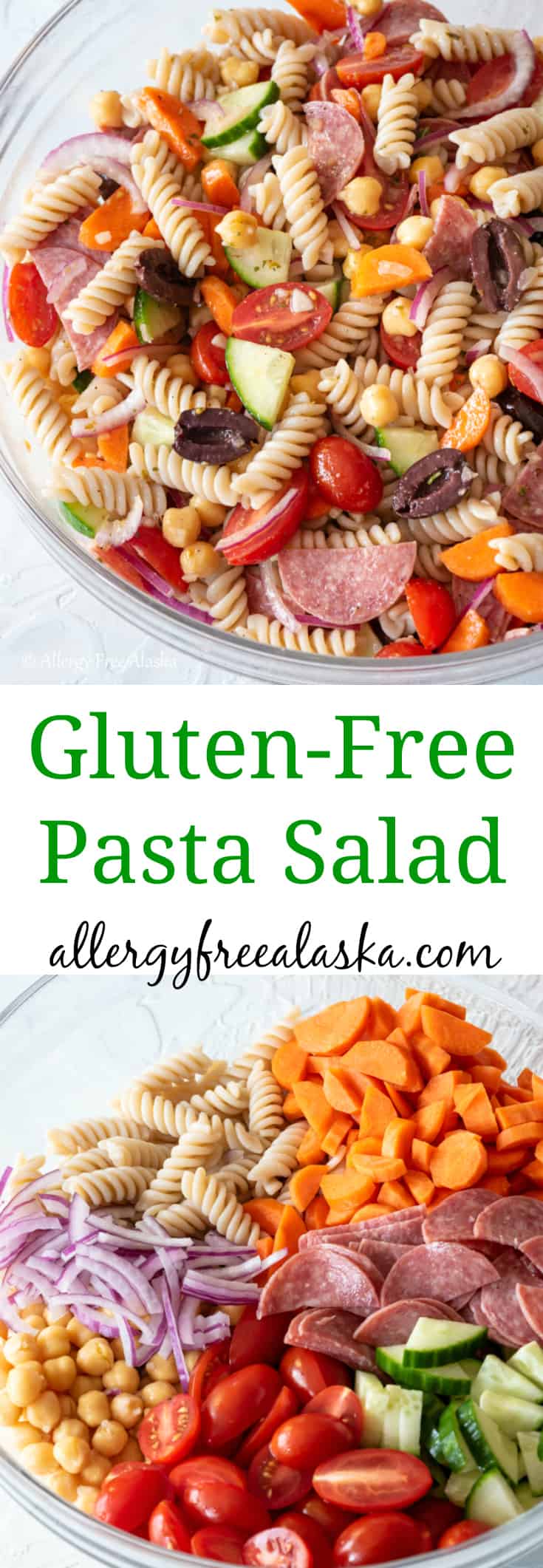 This Gluten Free Pasta Salad is a beautiful array of complimentary flavors tossed with a savory Greek-style salad dressing that my whole family loves.