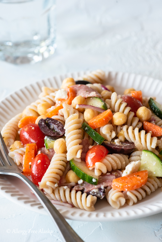 This Gluten Free Pasta Salad is a beautiful array of complimentary flavors tossed with a savory Greek-style salad dressing that my whole family loves.