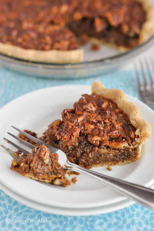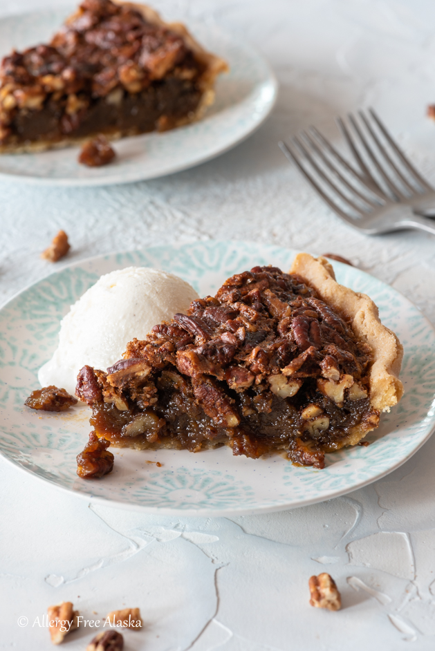I use Earth Balance – they have a soy-free, corn-free version available. You can substitute coconut oil, but it will have a slight influence on the flavor, and the dairy-free pecan pie filling won’t set up as well at room temperature. You might need to refrigerate the pie to help it fully set.
