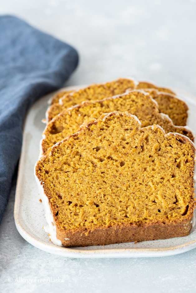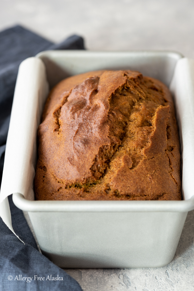 My household isn’t complete during the holidays without the scent of freshly baked gluten-free pumpkin bread. And this is my go-to recipe. Each perfectly tender bite reminds me of Starbucks pumpkin slices, but without gluten, dairy, nuts, corn, or soy. The wonderfully sweet flavor is spiked with warm autumn spices, and is delightful with a comforting cup of coffee or tea.