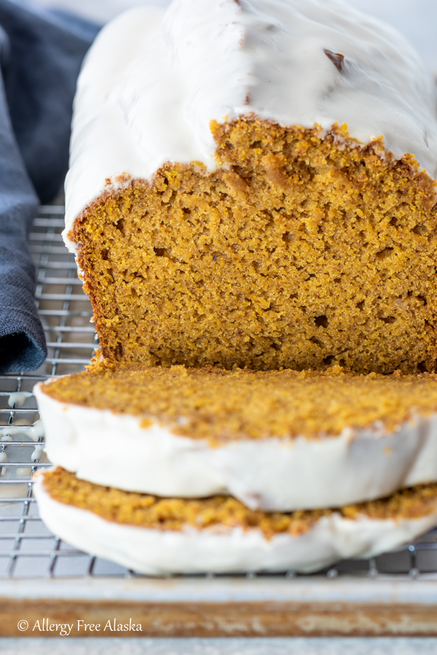 - Streusel Style – Enjoy a pumpkin coffee cake experience with just two more steps. Make the Cinnamon Streusel from my Gluten-Free Streusel Coffee Cake recipe, and evenly sprinkle the crumbles atop the batter in your loaf pans before baking. You can omit the icing, or drizzle a little over the streusel after baking for a true dessert.