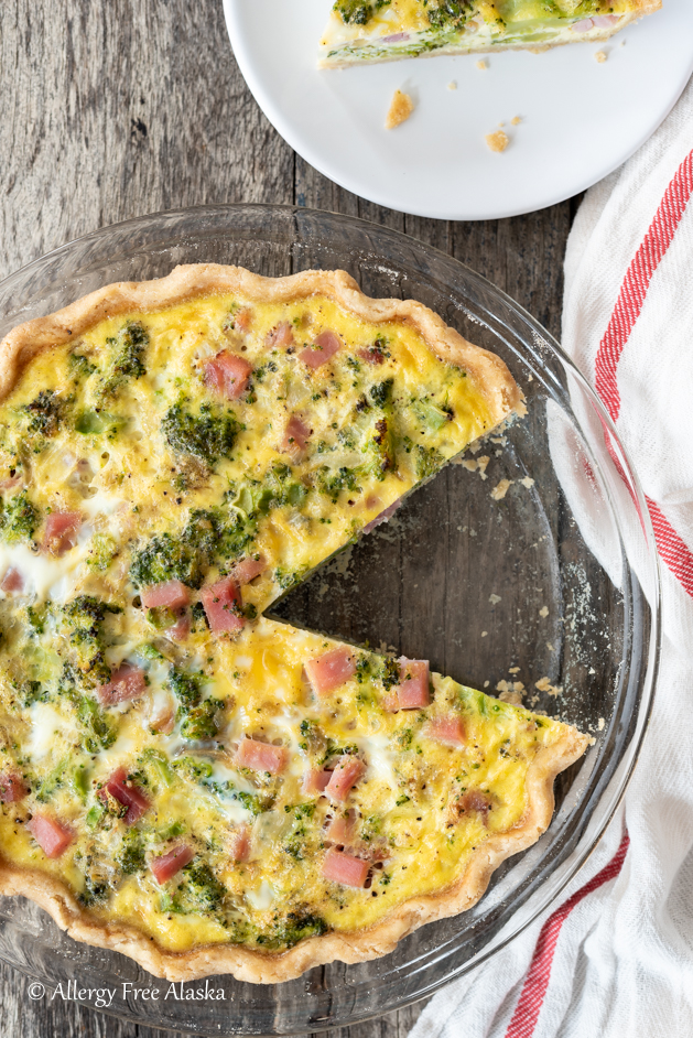 This gluten-free quiche is such a treat for my family. It starts with an incredibly flaky gluten-free pie crust filled with fluffy eggs and a savory ham and broccoli filling.