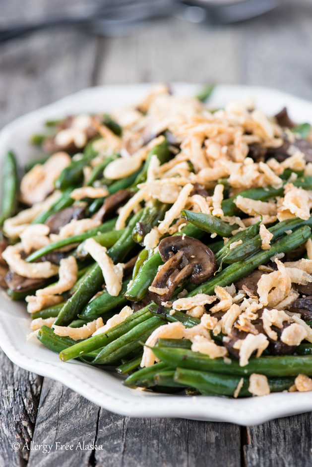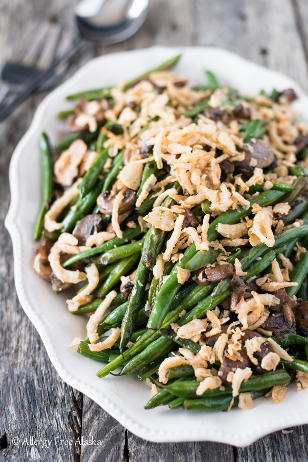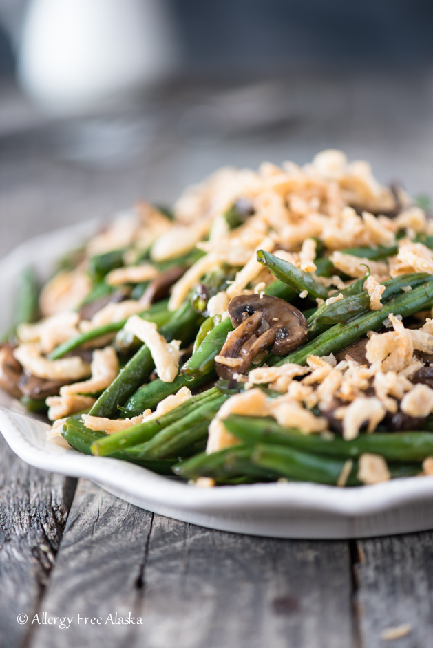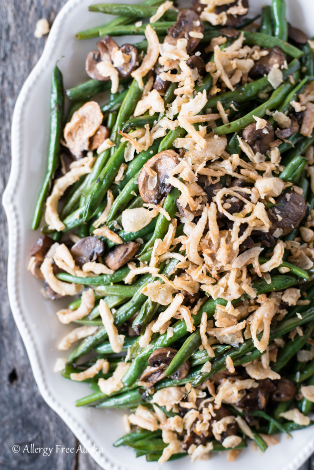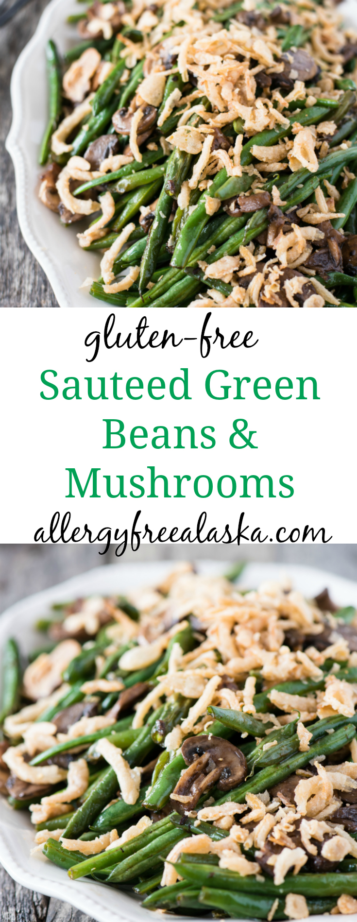- Transfer the sautéed green beans and mushrooms to a platter and garnish with gluten-free French Fried Onions.
