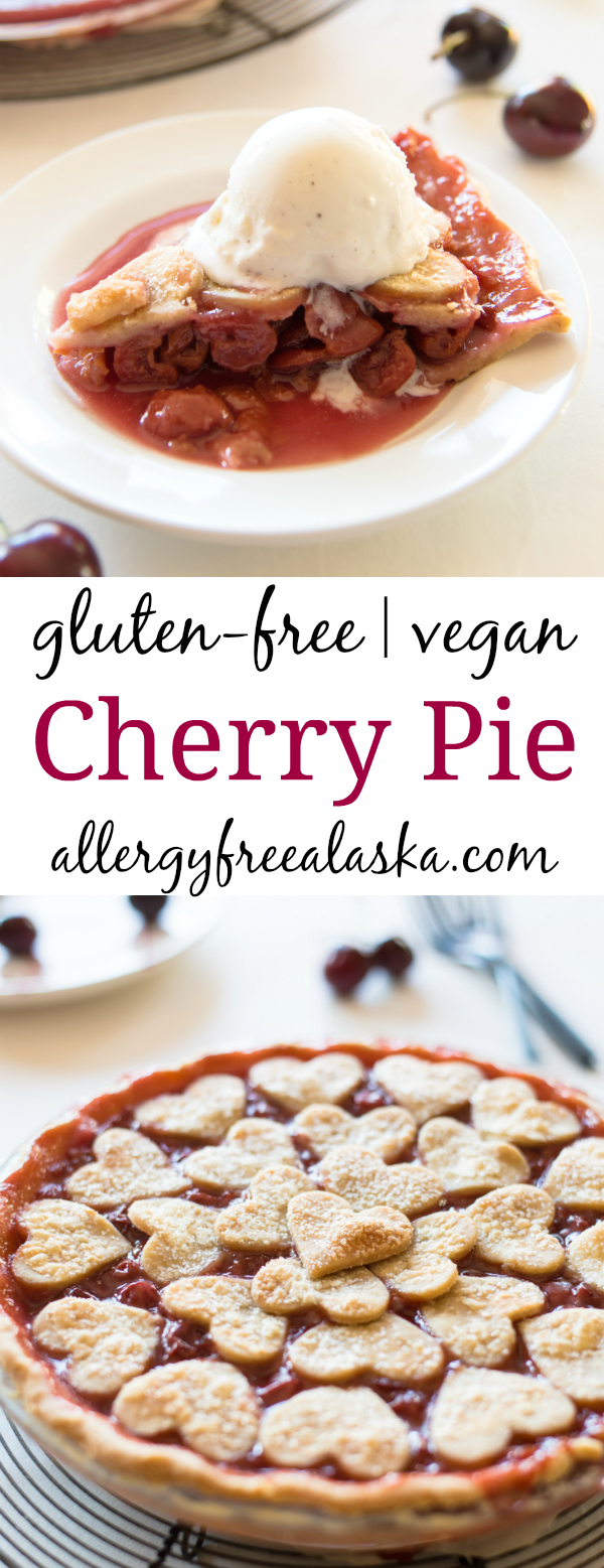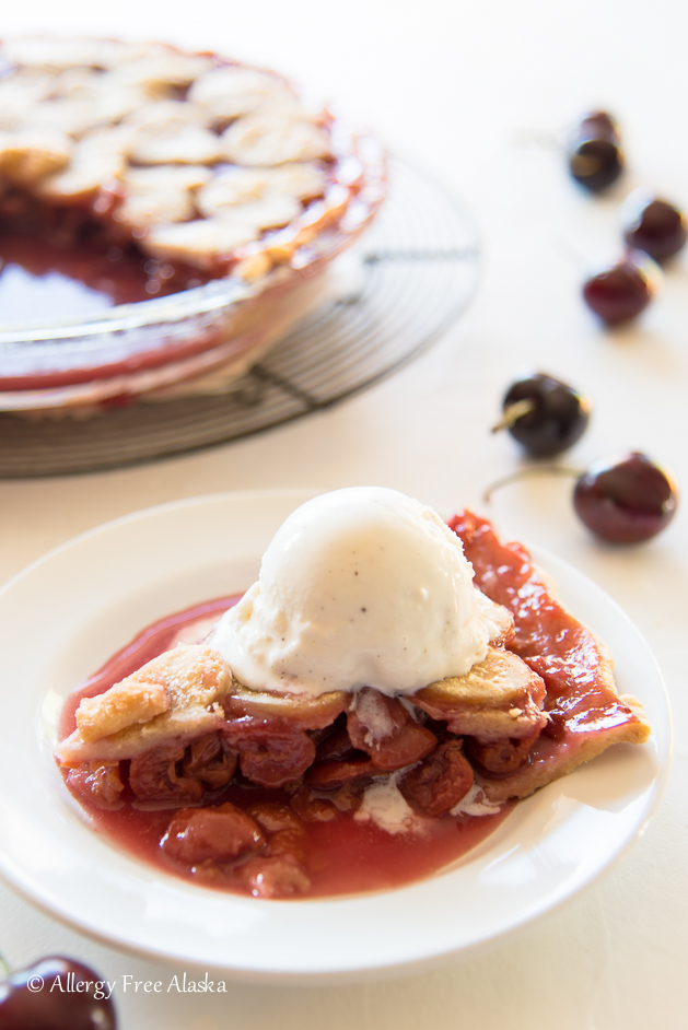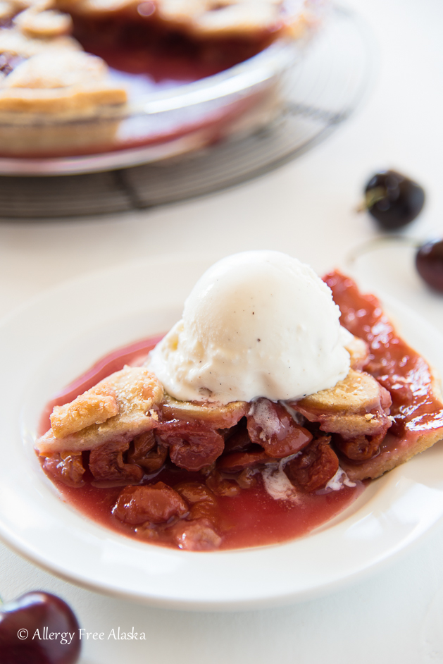 I prefer to serve my pie at room temperature, or cold, and topped with dairy-free vanilla ice cream. The vanilla ice cream with the cherry filling is a match made in heaven.
