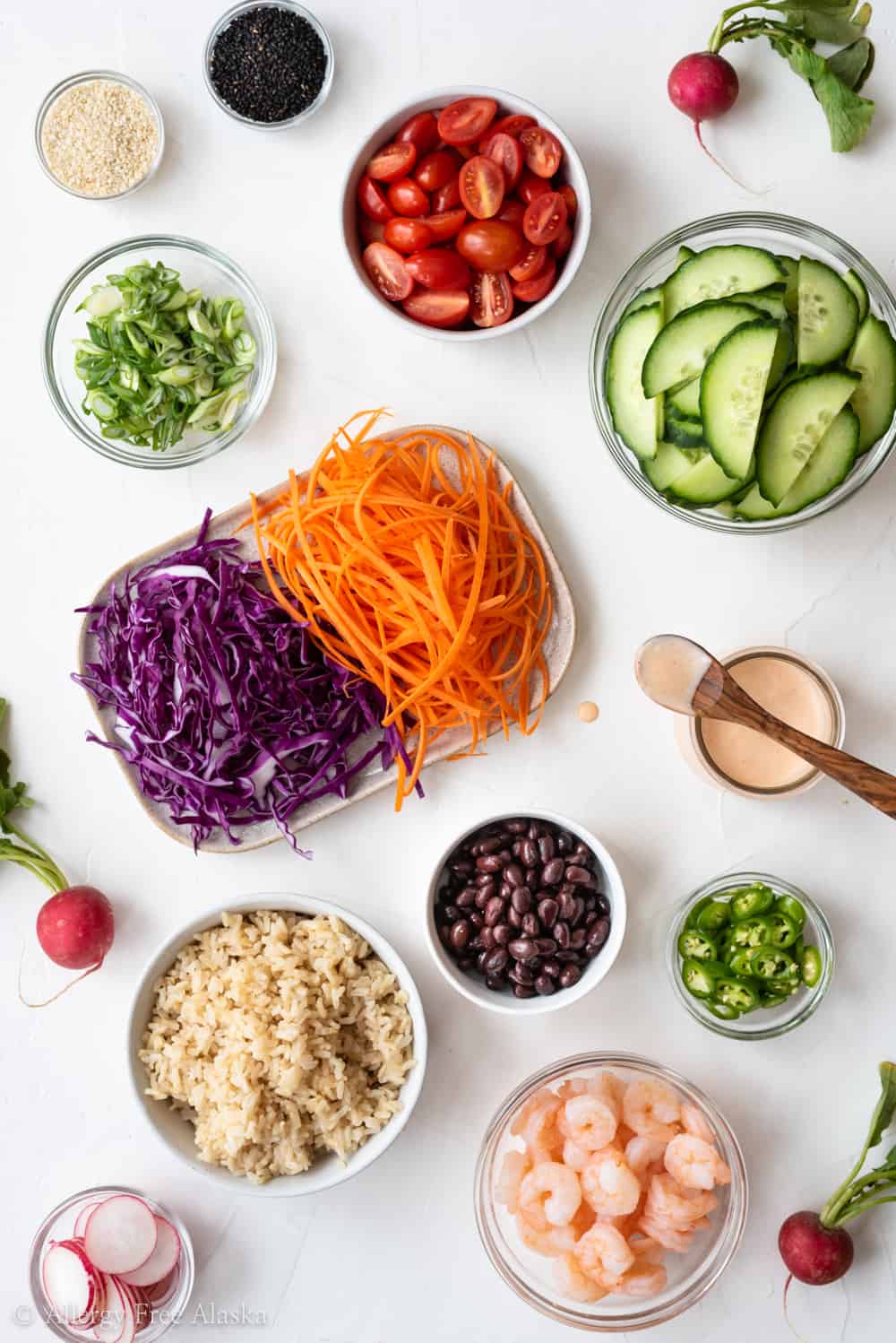 - Other Veggies– Carrots, cucumbers, tomatoes, green onions, etc. Poke bowls are a wonderful way to use those leftover veggies lurking in your refrigerator.