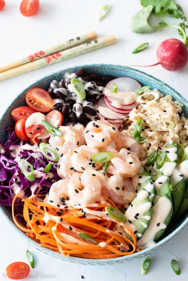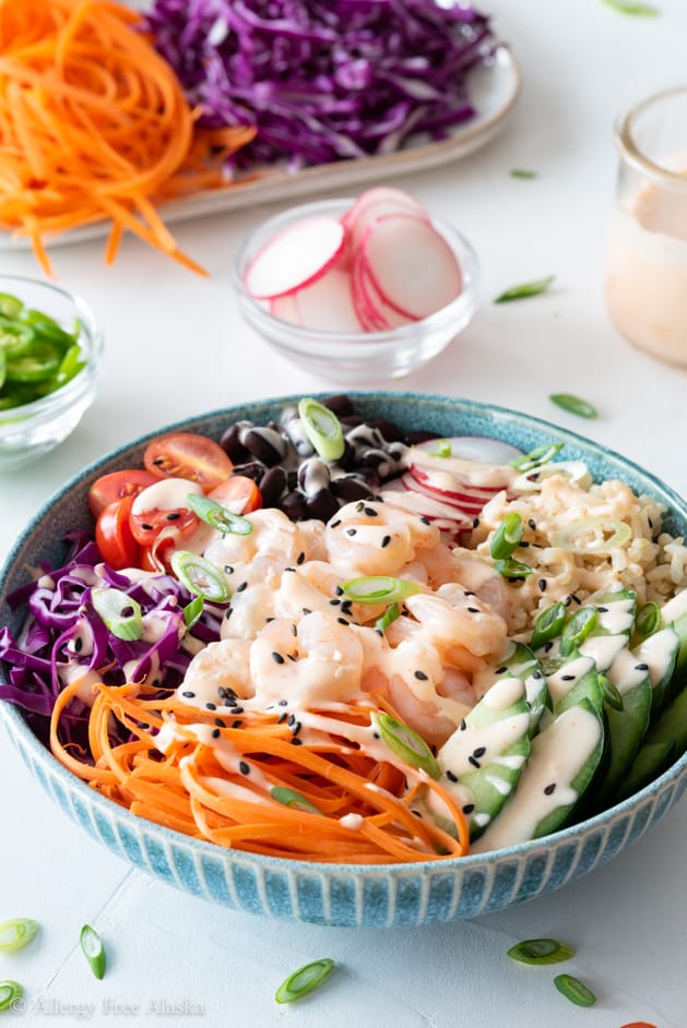 Full of fresh, healthy ingredients, this shrimp poke bowl is a feast for the eyes and your stomach. It's a satisfying meal filled with lean protein, whole-grain brown rice, fresh veggies, and a spicy mayo that packs a spicy punch!