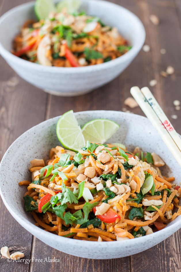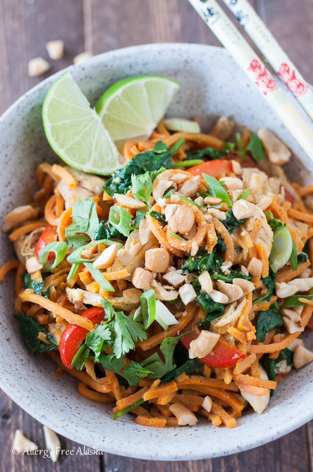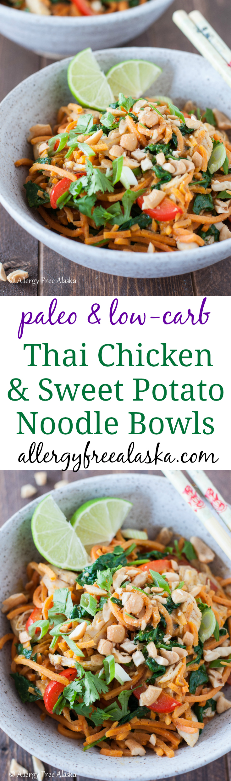 These Thai Chicken & Sweet Potato Noodles Bowls are a delicious way to give into your Thai craving while staying low-carb. Spiralized sweet potato “noodles” take the place of rice noodles, and are covered in a spicy satay-like sauce.