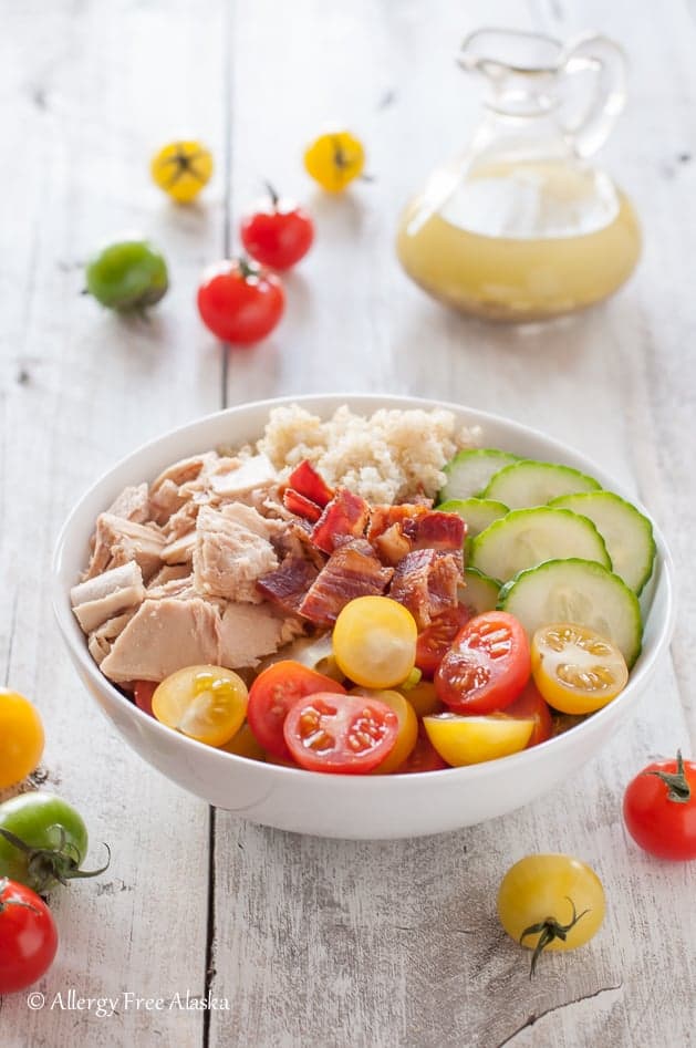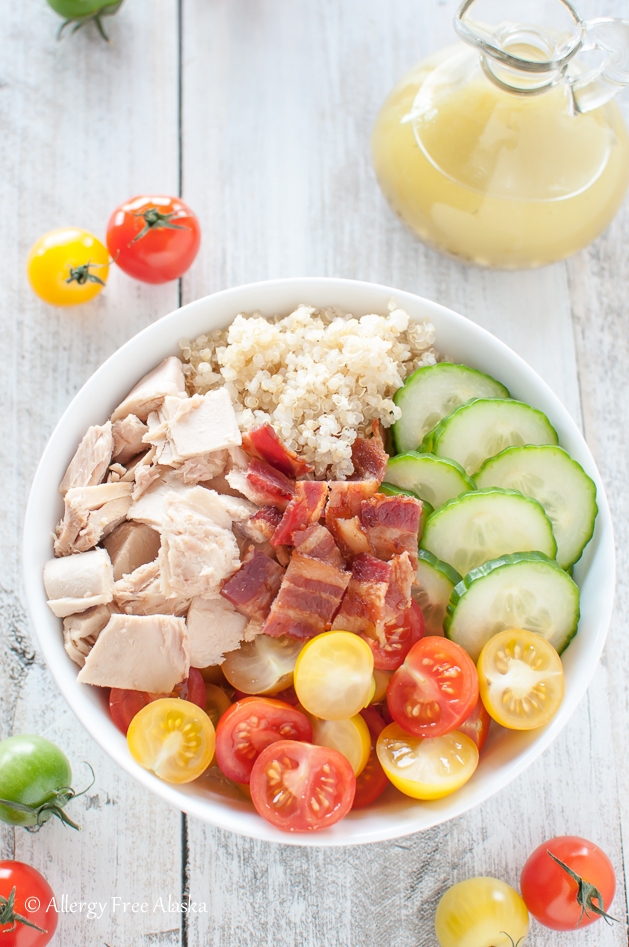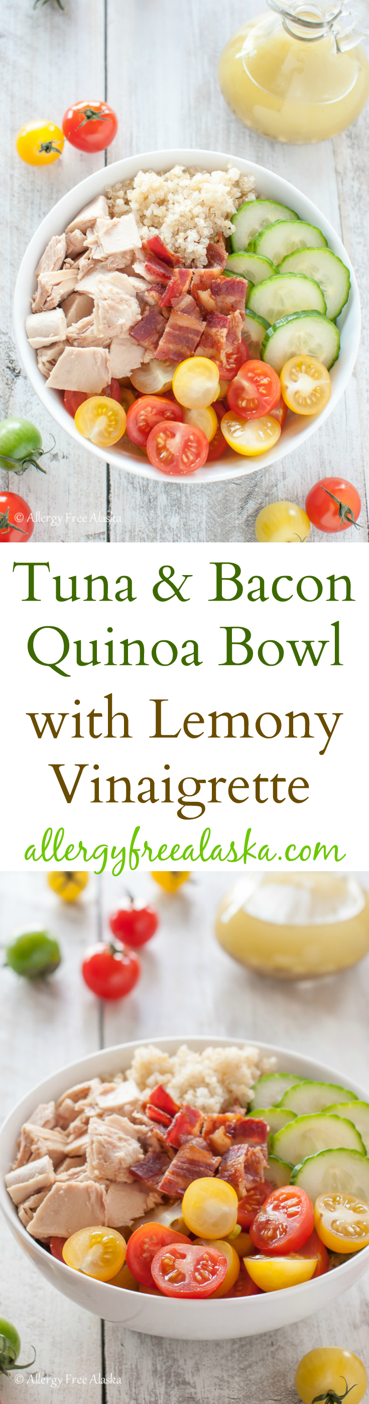 This Tuna and Bacon Quinoa Bowl with Lemony Vinaigrette came to fruition one afternoon when I was trying to think of some new easy and convenient, yet healthy meal ideas. We've been so busy lately, that our dinners have often times been made on the fly.