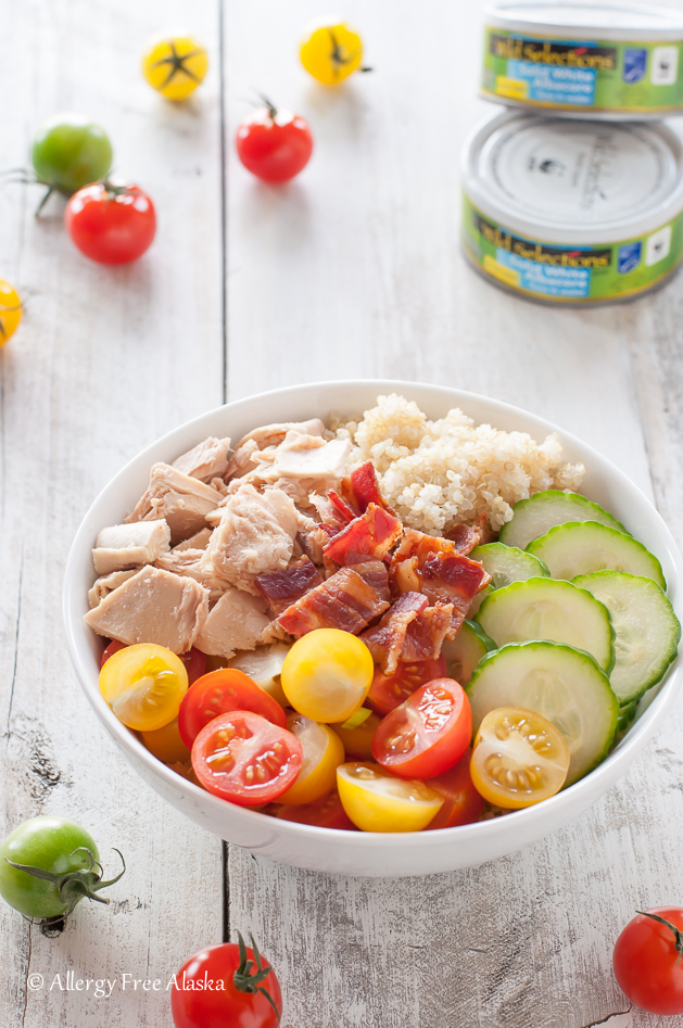 Cold crisp cucumbers are combined with tart cherry tomatoes, premium quality tuna, nutty quinoa, and salty bacon in this Tuna and Bacon Quinoa Bowl.